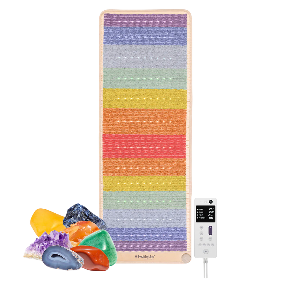 Special edition PEMF Far Infrared Heating Mat featuring seven chakra-aligning gemstones.